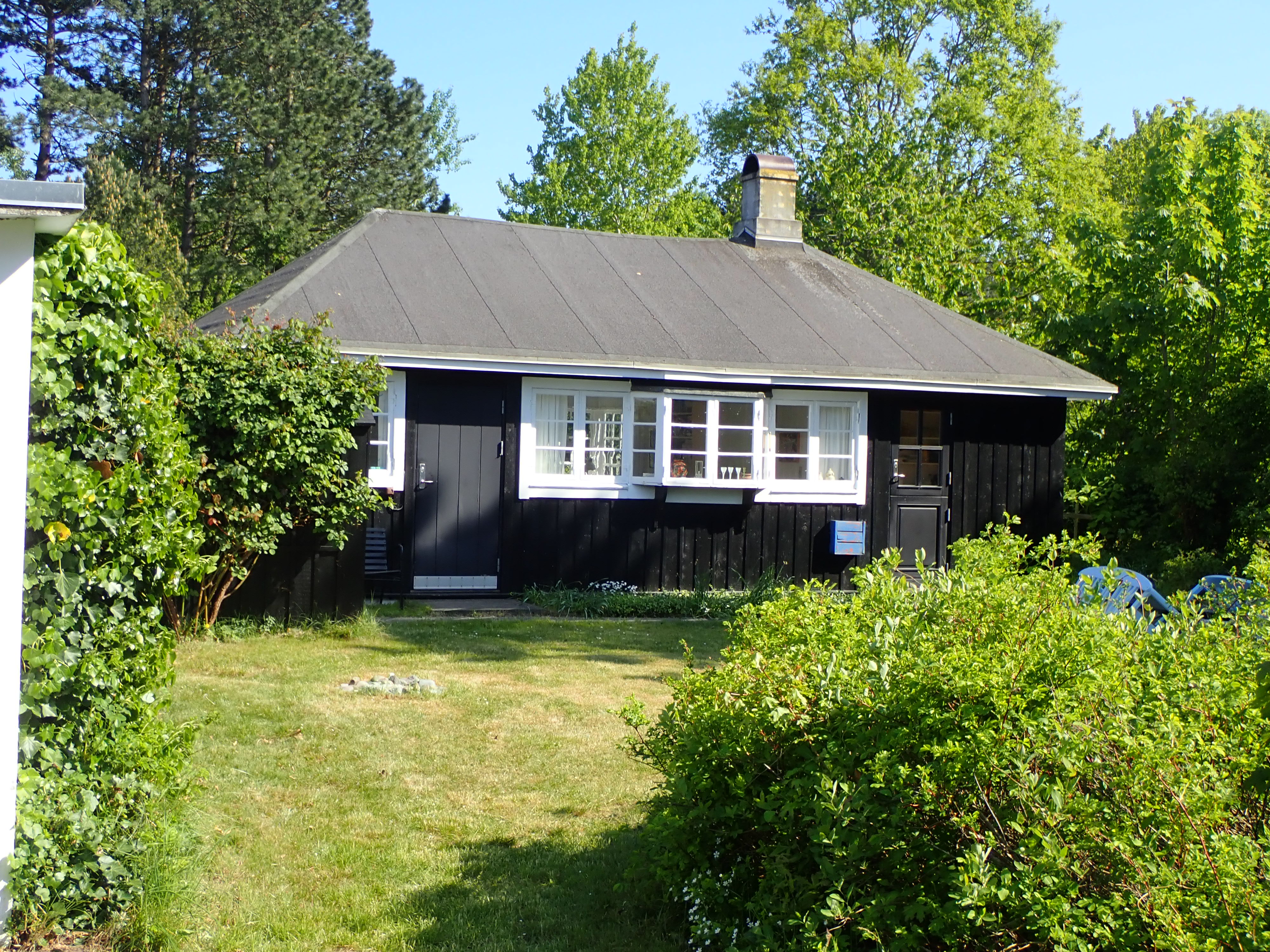 sorttjærede med hvide vinduer og døre og med helvalmede paptage og en lille veranda ved